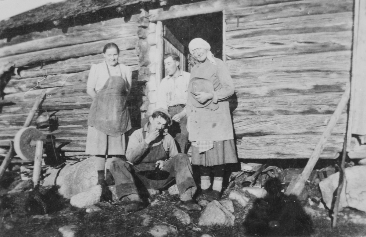 På bildet, fra venstre : Klara Wold, Hans Wold, Trine Wold Lund, Johan Lund (sittende). Bildet er tatt foran gammellåven under en pause i korntreskinga. Korntresking foregitt vanligvis like før jul. Det var tungt arbeid, da treskemaskuna måtte draes med håndmakt.