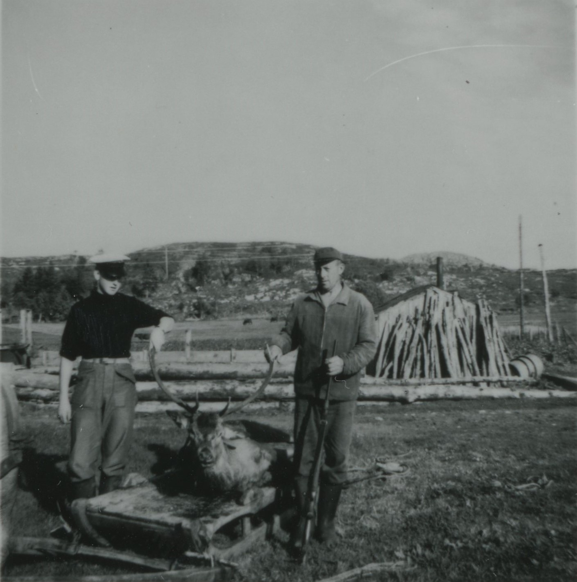 Bildet viser de to med en skutt hjort. Den lille bygningen i bakgrunnen er motorhuset ved sagbruket på Hofstad. Det ble drevet av en bensinmotor, vi kan se eksosrør stikke opp fra taket.