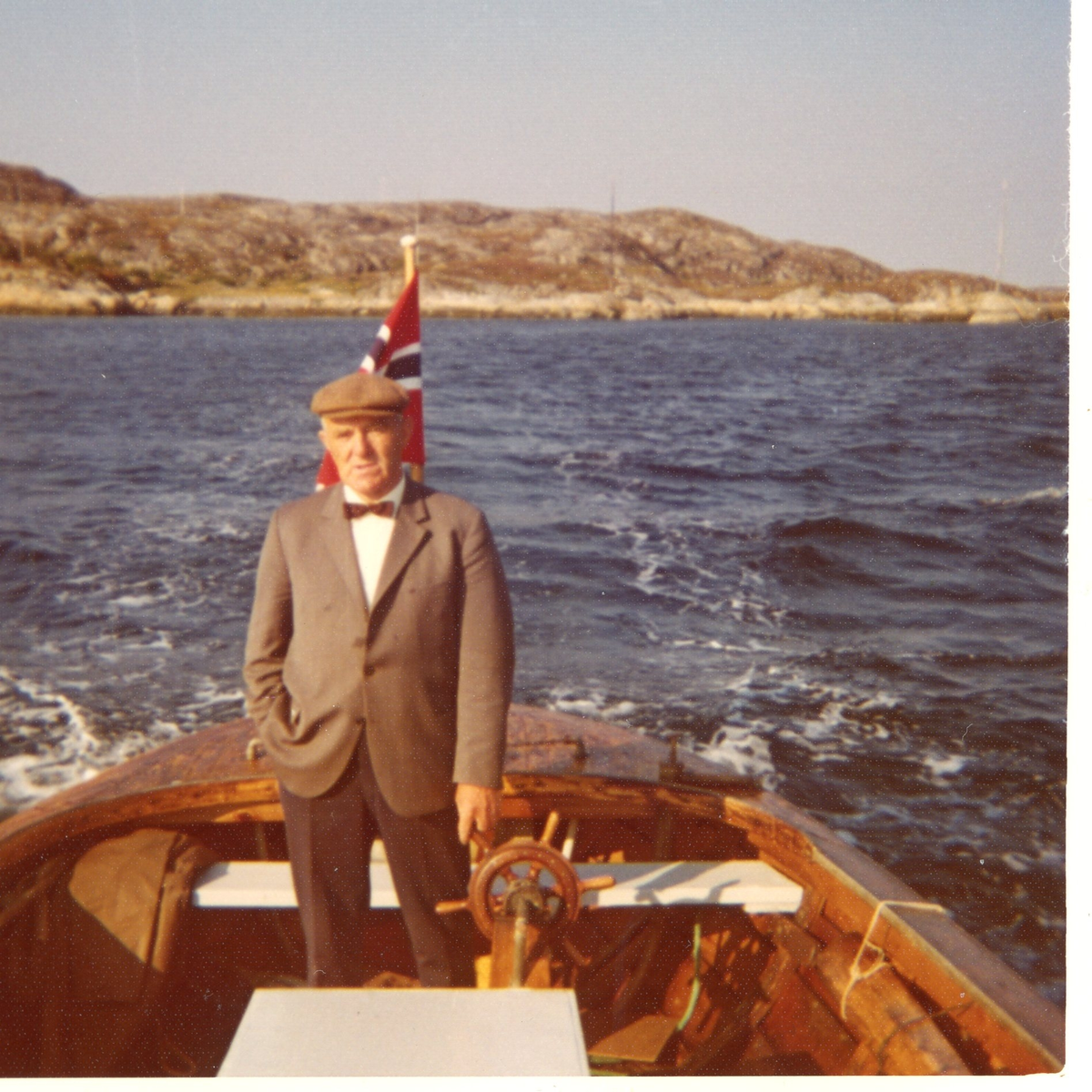 Martin Skaaren, skysskar og forteller, kjører båt. Kystlandskap i bakgrunnen